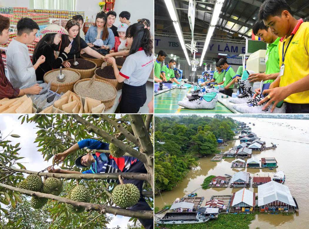 Khi tỉnh An Giang mới được thành lập, người dân có điều kiện phát triển, kết nối thuận lợi hơn. Trong ảnh: Công ty Vina Phú Quốc Travel hướng dẫn du khách tham quan cơ sở trải nghiệm sản phẩm du lịch tại Phú Quốc; sản xuất giày da tại Công ty Cổ phần Thái Bình Kiên Giang; nông dân An Giang chăm sóc vườn sầu riêng và nuôi cá lồng bè, góp phần đa dạng sinh kế, nâng cao thu nhập, thúc đẩy kinh tế địa phương.
