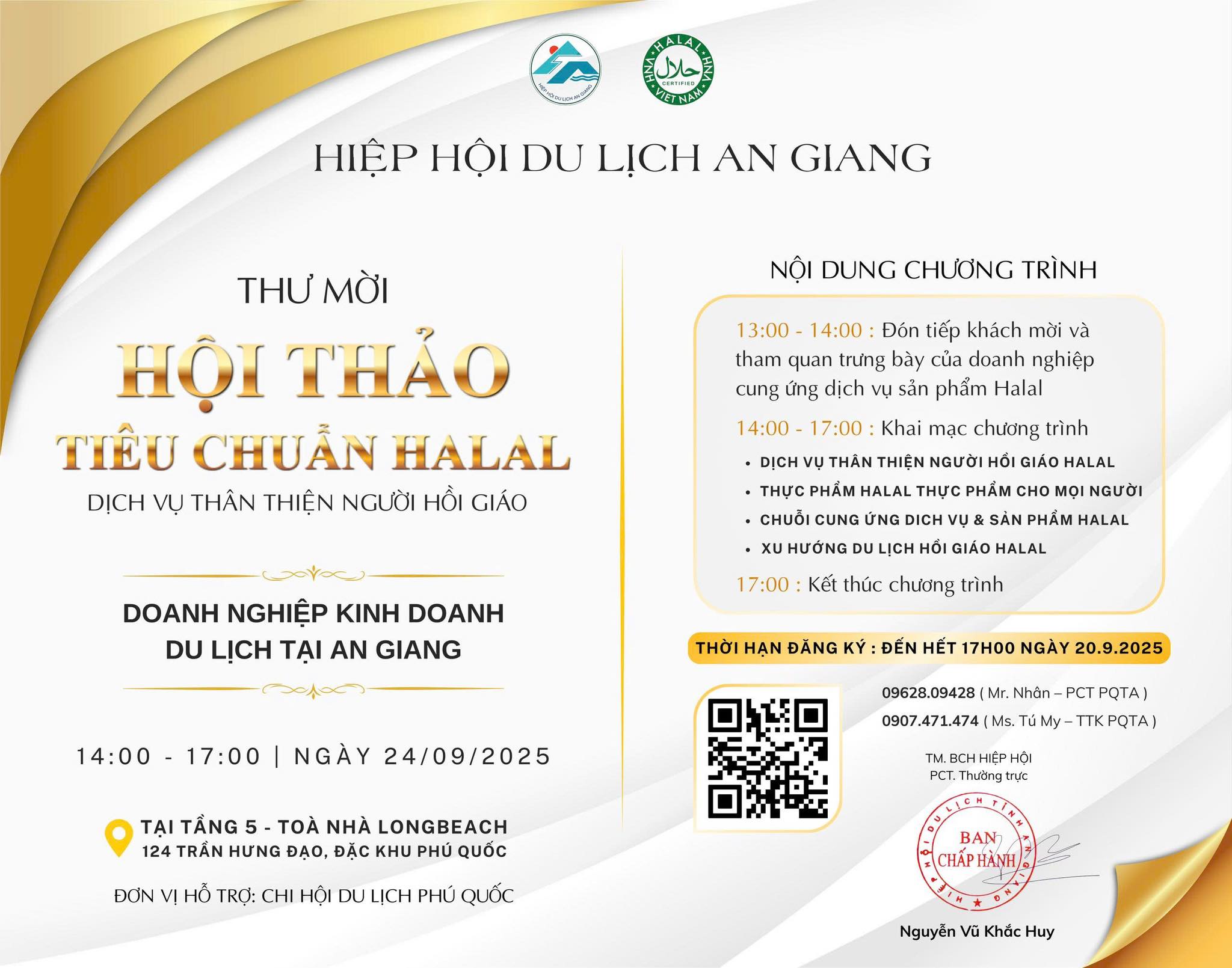 Nhằm hỗ trợ các doanh nghiệp du lịch (nhà hàng, khách sạn, điểm tham quan, lữ hành, đơn vị vận chuyển, hướng dẫn viên…) nâng cao kiến thức và hiểu rõ hơn về tiêu chuẩn phục vụ Halal, Hiệp hội Du lịch An Giang, với sự hỗ trợ của Chi hội Du lịch Phú Quốc, phối hợp cùng Công ty TNHH Halal Quốc gia Việt Nam tổ chức: